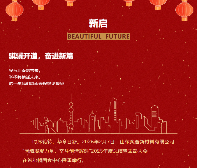 祥蛇擺尾辭舊歲,駿馬昂首啟新程。回望2025,奕普新材于時代浪潮中奮蹄篤行,在市場風(fēng)云中合力攻堅,以堅實足跡刻下奮斗的年輪。展望2026,我們將繼續(xù)高擎“團結(jié)凝聚力量、奮斗創(chuàng)造輝煌”的信念旗幟,以龍馬精神拓路前行,以騏驥之速聚力飛躍,向著“國際一流綠色阻燃材料企業(yè)”的戰(zhàn)略愿景全力馳騁,共赴嶄新輝煌!